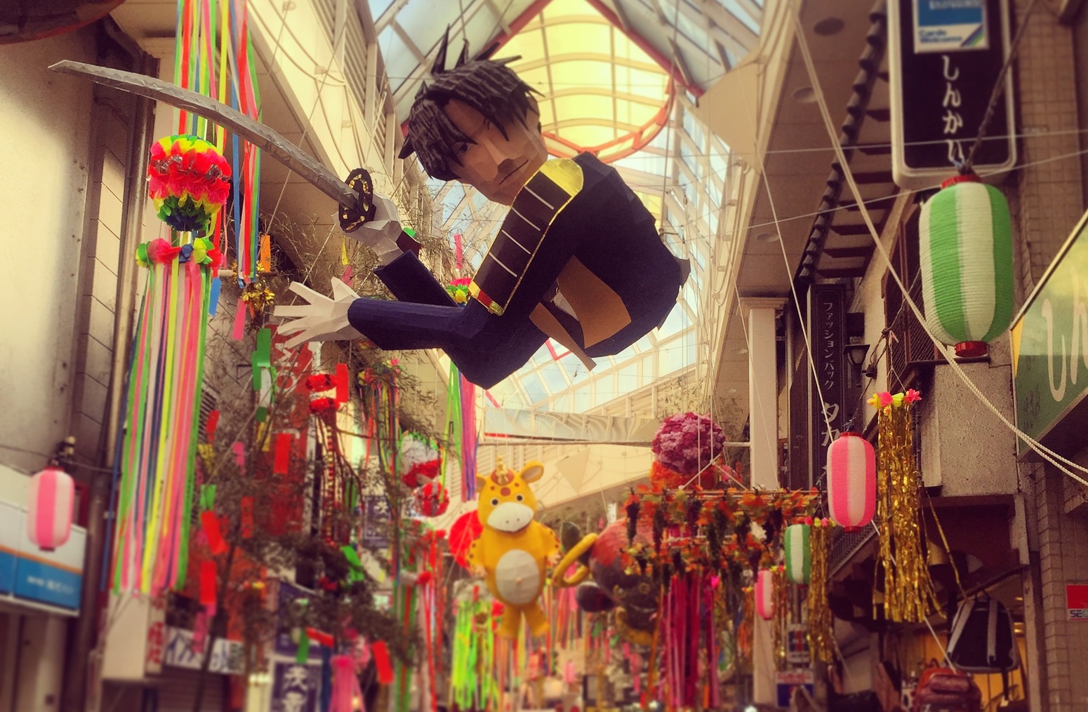 For its annual Tanabata festival the length of Asagaya’s main shopping arcade is covered with bright colorful streamers and papier-mâché decorations. Local groups and businesses build unique 3D creations promoting their wares or depicting their favorite characters and celebrities from anime characters to sporting heroes.