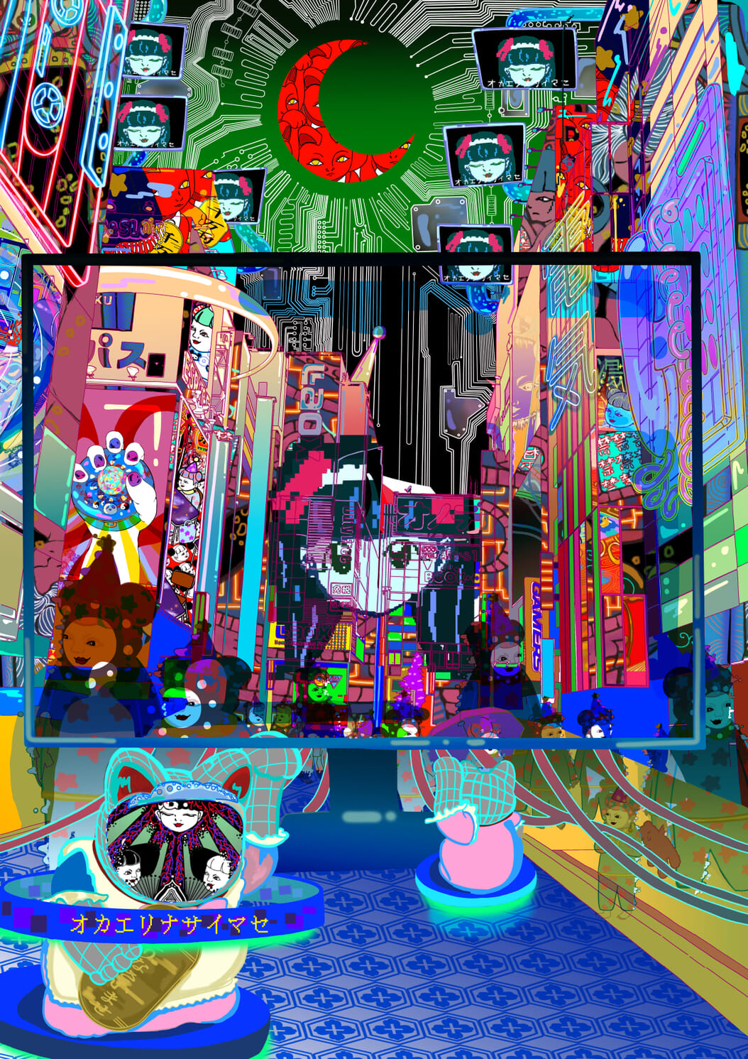 Eight creators have designed works expressing the future of the three Tokyo shopping areas: Nakano Broadway, Nakano Sun Mall and Akihabara Shopping Arcade. The overarching theme is “Retro Future City.” The works are being exhibited throughout the three shopping areas in October, using flags and banners. Original trading cards featuring shopkeepers and stores in the shopping arcades are also being created and displayed at each store.