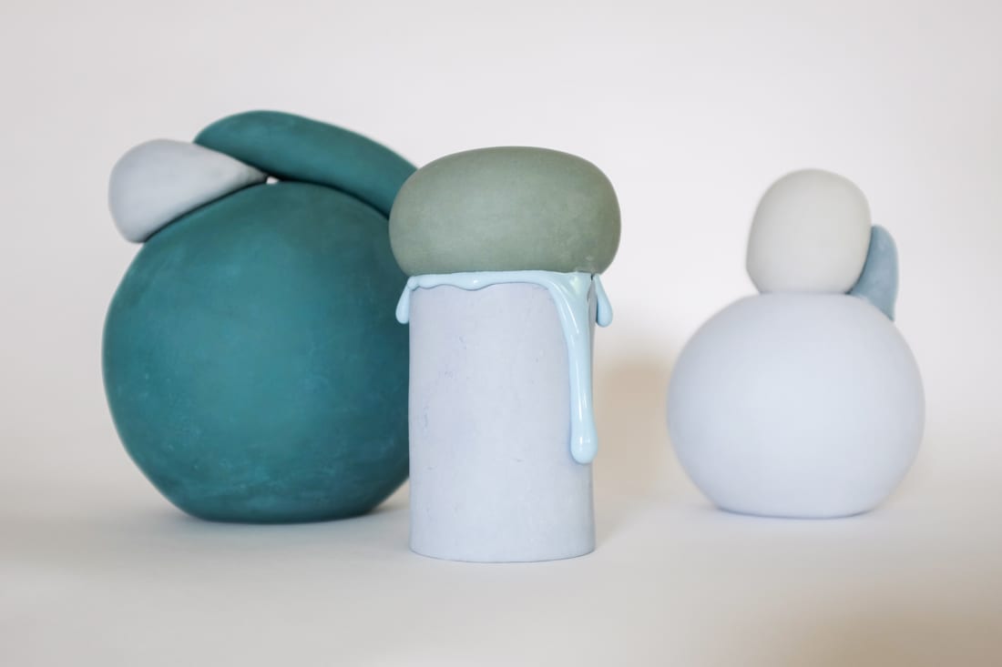 Curator’s Cube in Nishishinbashi presents LA-based sculptor Maria Moyer’s latest exhibition, “Field Notes.” Moyer employs traditional hand-building techniques as she wants to leave traces of her touch, however clumsy and imperfect. Coined “clayze” instead of glaze, she shapes the glaze by hand to give it a nudge in the direction she wants it to melt. The stoneware surface treatment is called “terra sigilatta,” which uses slip then cracks in to capillaries during firing and making a topographical statement.