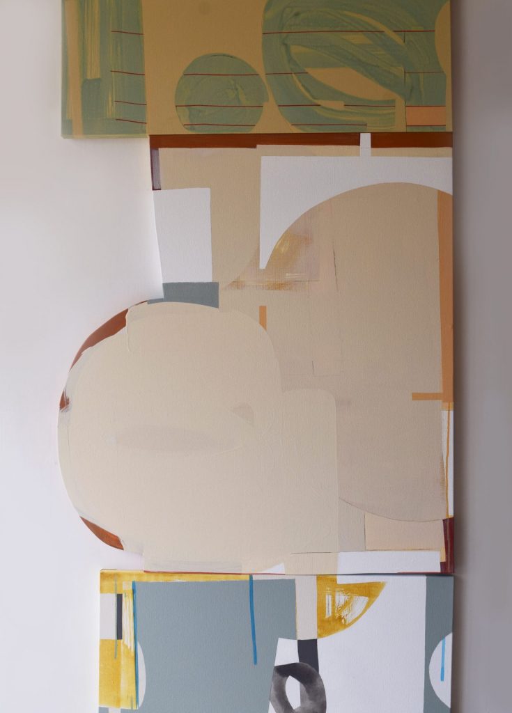 Top: “D-1” 2021, Acrylic paints, pencils, canvas on wooden frame, 803×652×25mm | Middle: “D-2” 2021, Acrylic paint, pencil, canvas on shaped panel, 90×80×25mm | Bottom: “D-3” 2021, Acrylic paints, pencils, canvas on wooden frame, 727×500×25mm