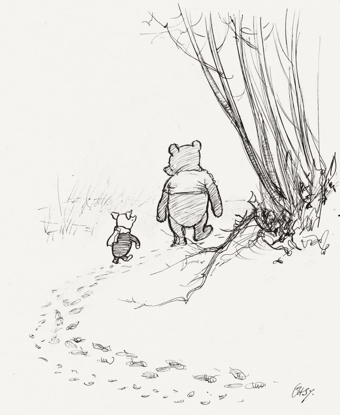 ‘Pooh and Piglet go hunting’, Winnie-the-Pooh chapter 3, pen and ink sketch by E. H. Shepard, 1926. From the collection of Clive and Alison Beecham © The Shepard Trust