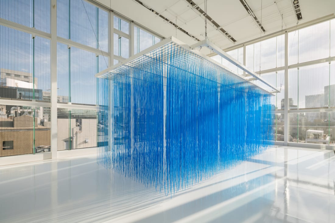 Encompassing the entire exhibition space, the emblematic work from the late Venezuelan artist’s groundbreaking collection, “Pénétrable BBL Bleu,” is an interactive work that invites the observer to be immersed in its kinetic and optical functions.