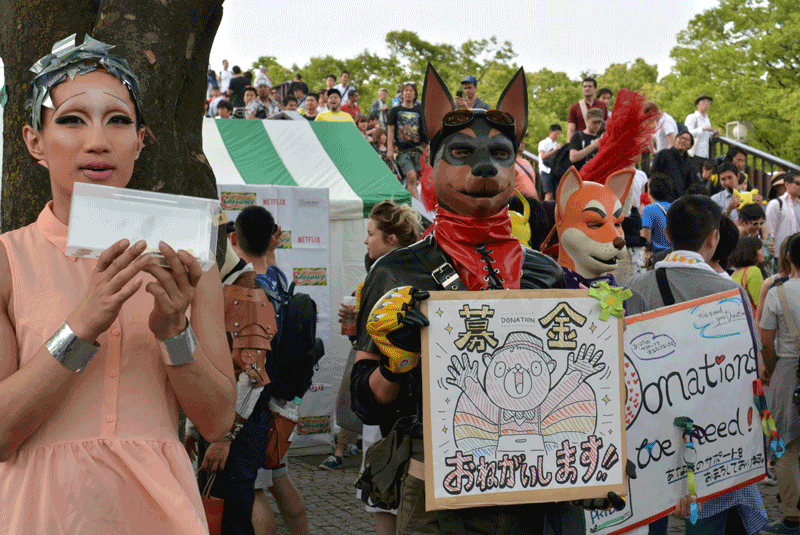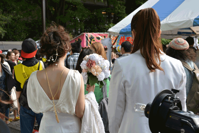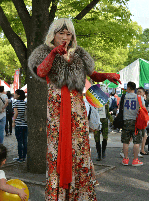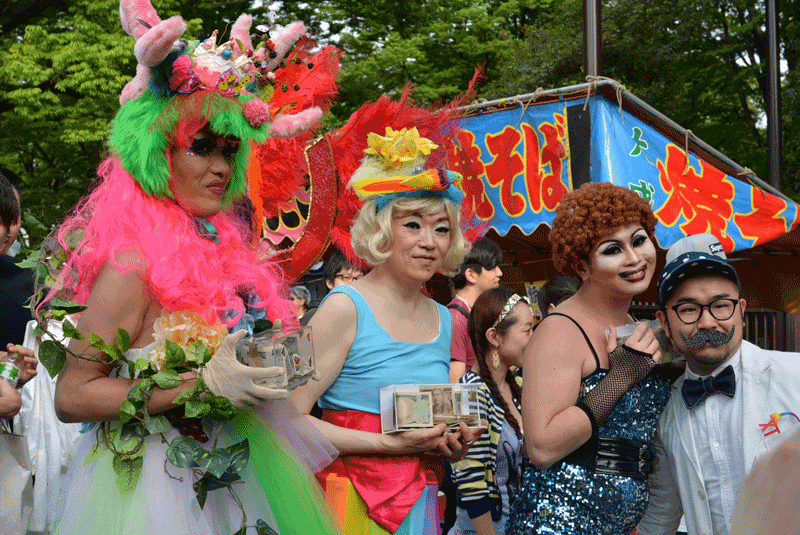 A hot spring sun high overhead, wafts from grilling food blowing over the grounds, and a crowd thick with bright colors filled the area. Over on the main stage, “rickshaw boys” danced in the heat, and speeches were balanced out with musical acts, shamisen performances, and drag queen shows. Hundreds of booths, each hosted by companies supporting the cause, were draped in rainbow flags, offering face painting, contests, deals, and collecting signatures for petitions. Drag queens meandered the grounds, collecting donations in exchange for goofy photos.