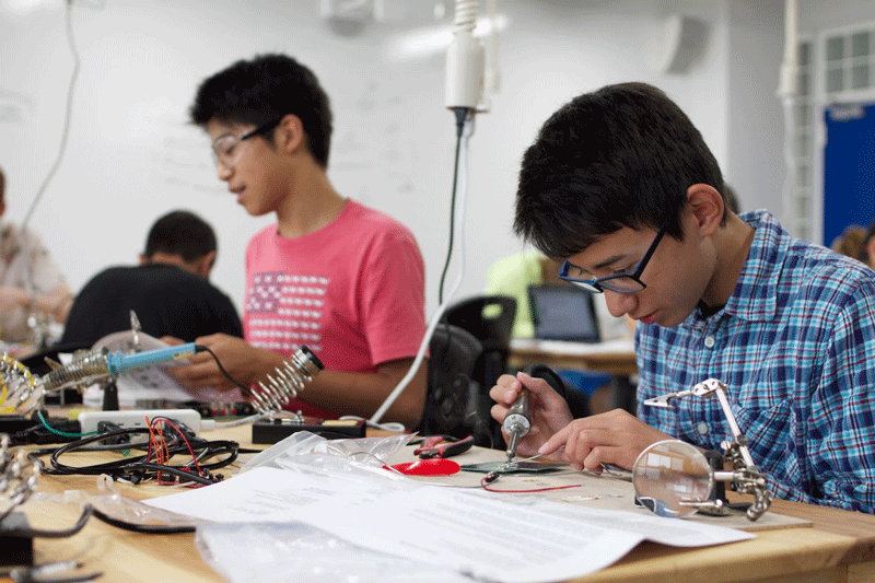 Gathered around their tables in one classroom, a group of ninth grade students are soldering circuit boards and working on basic programming projects. In another classroom, high schoolers are working in pairs, taking turns to create logo designs for clients.