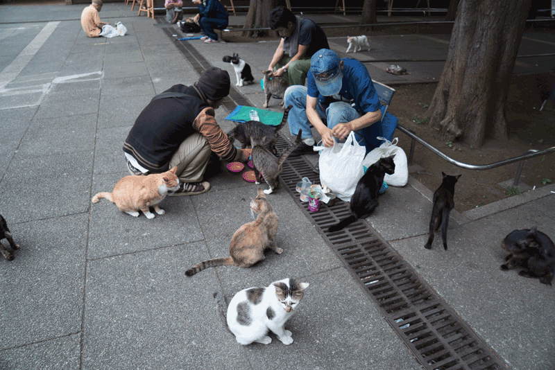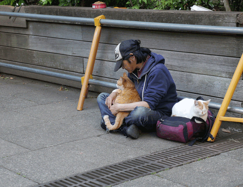 That’s where the Higashi Ikebukuro Chuo Koen comes in. It’s right next to Ikebukuro’s landmark, Sunshine City, a 7-minute walk away from Ikebukuro Station and a 3-minute walk away from Higashi Ikebukuro station. It’s a typical, central Tokyo public space. It has some trees, a few benches and a water feature that has been turned off to cut costs. It’s also home to a fairly sizable population of homeless vagabonds. What makes this particular park special is that the homeless vagabonds are of the feline persuasion.