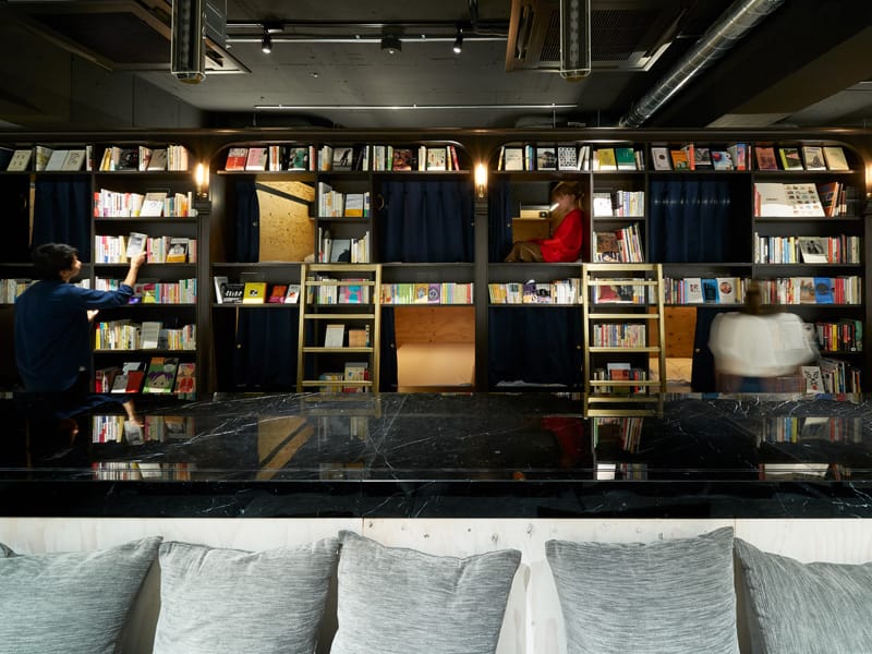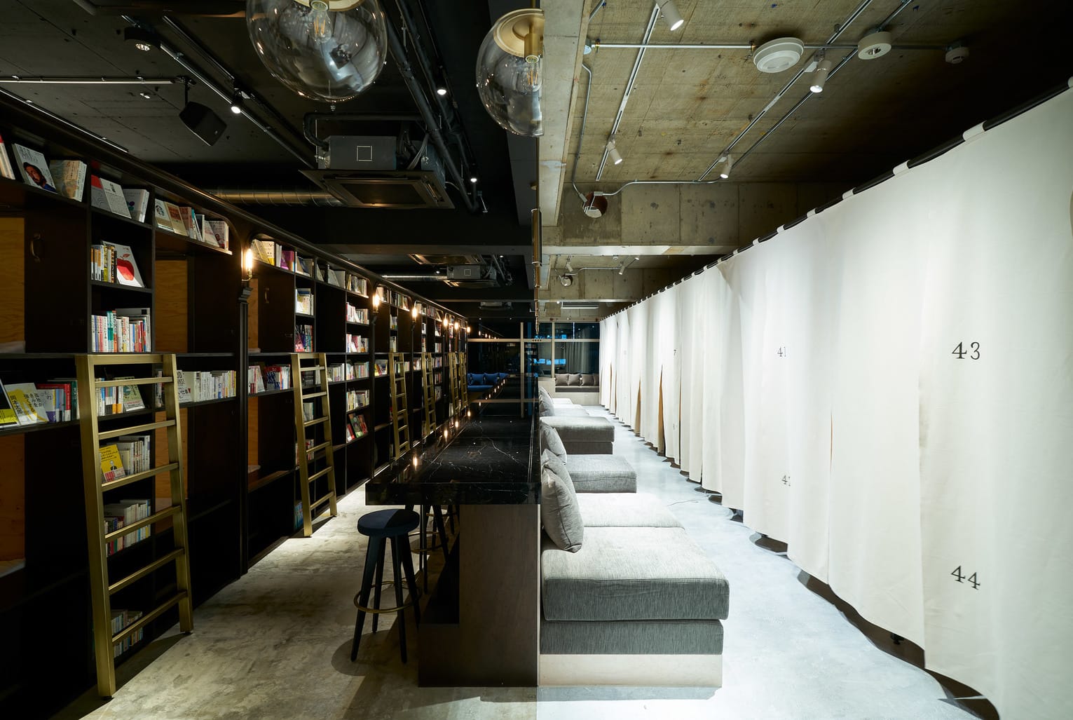 This branch of Book and Bed Tokyo is divided into two areas, one bookstore-themed and the other bar-themed. Both overnight guests and those popping in during the day can enjoy a full-fledged cafe and bar menu including original cocktails and coffee.
