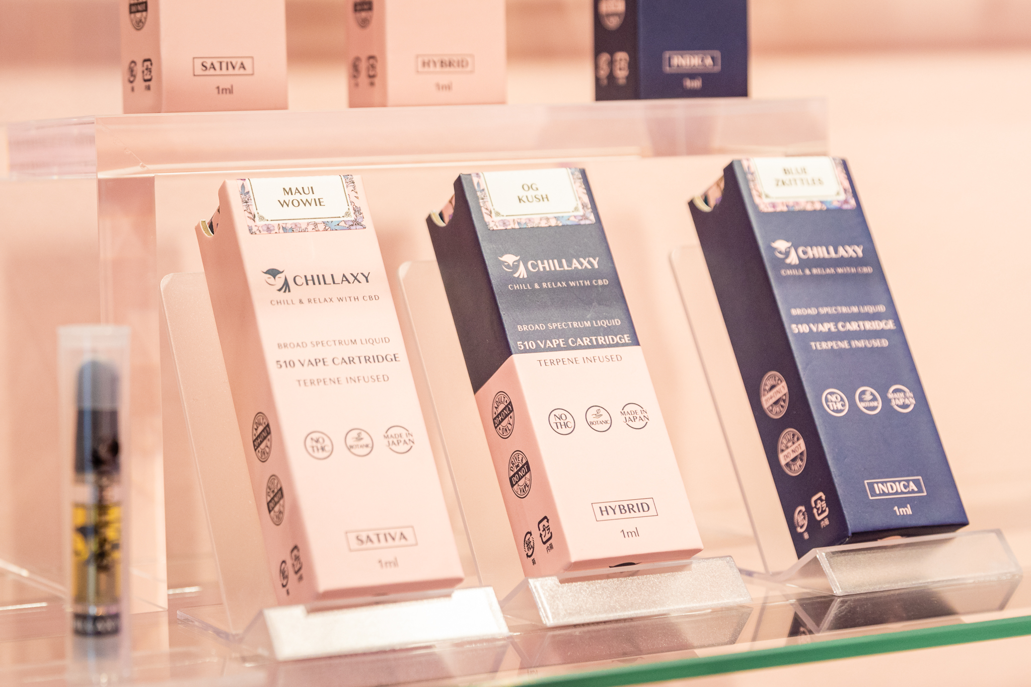 While many Japanese CBD brands operate through e-commerce sites, Chillaxy seeked to provide a physical home for CBD culture in Japan. Their Asakusa dispensary, located just a block away from Senso-ji’s Kaminarimon Gate, encourages customers to stop by and relax as they look through and try Chillaxy’s range of products.