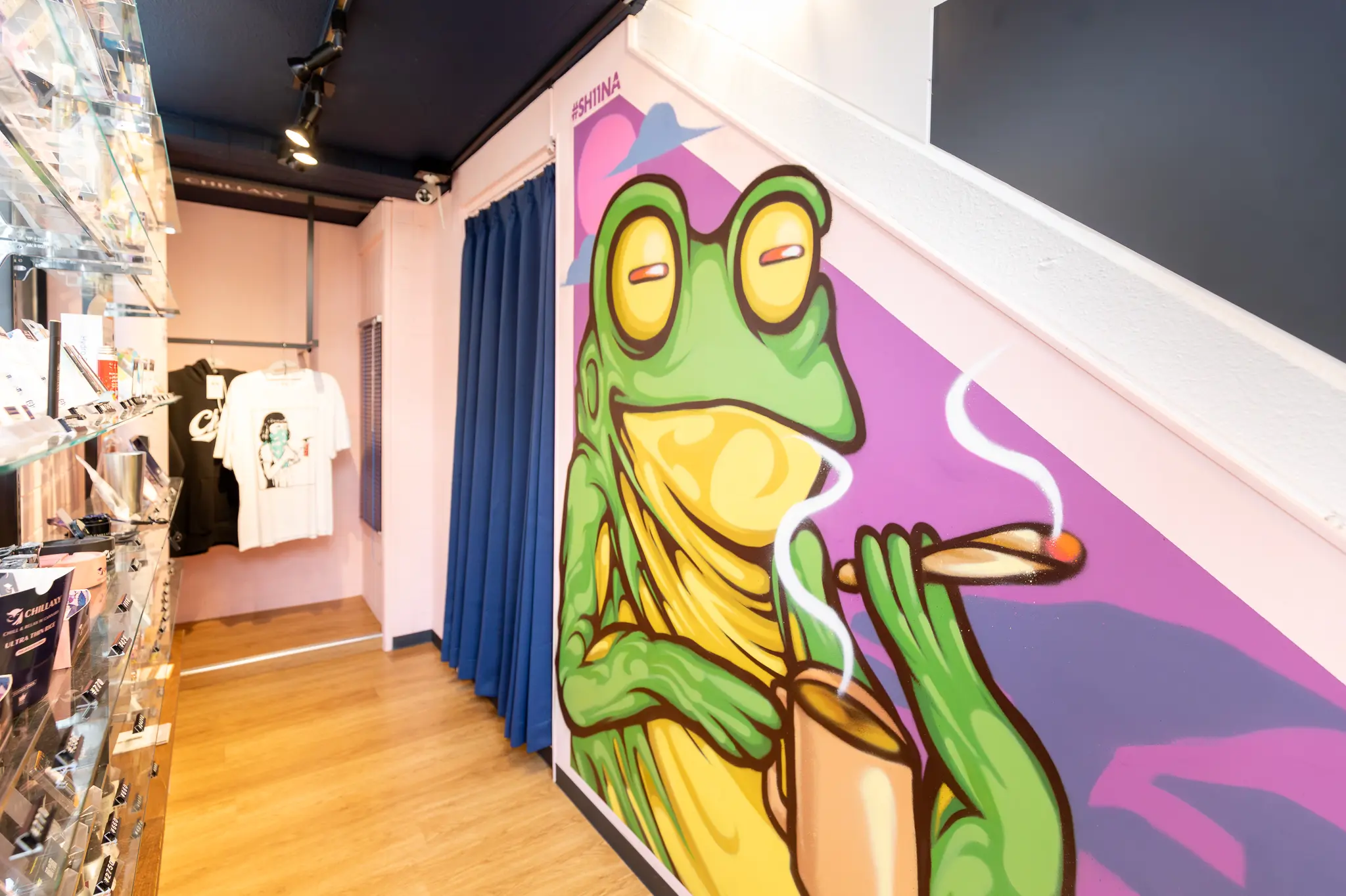 Chillaxy’s Harajuku location, which features a sleek CBD vending machine, doesn’t have much space but would be a good fit for travelers on the go. On the dispensary’s wall, a vibrant mural of a smoking frog by artist Shiina doubles as a popular photo spot, though Inoue emphasizes that this mural and artist really embody the brand. In contrast, their Yokohama store is more targeted to locals, though CBD enthusiasts and curious shoppers are welcome to all three stores.