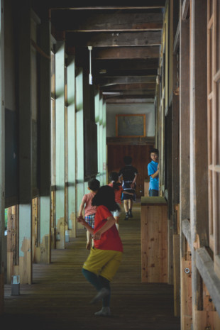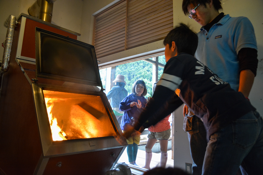 All food is produced on-site. Water is heated via a stove that delivers heat through newly installed pipes. The firewood is cut by students in the forest daily. An irrigation system that was dug just outside the front of the building can sustain crops of rice. A few LED lights, customized by a Tokyo University architect, are poised like barn owls on beams, and the walls of glass provide light and warmth during the day.