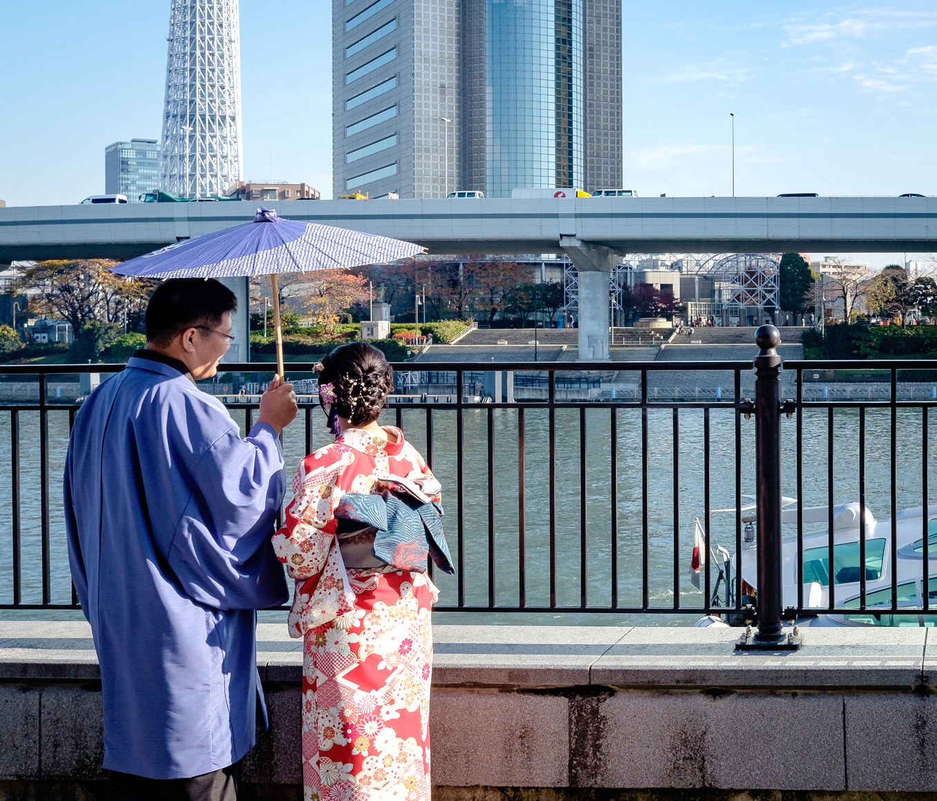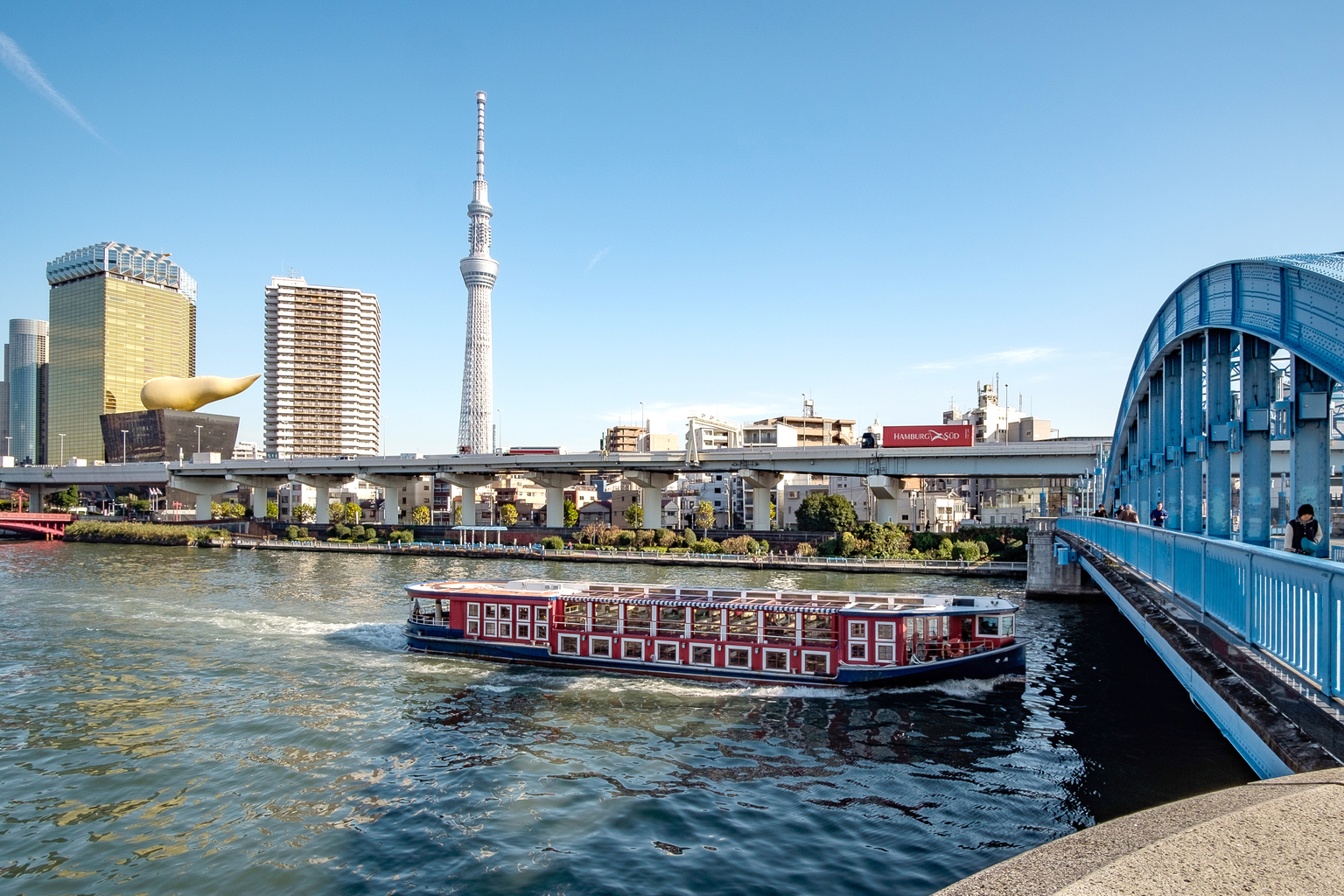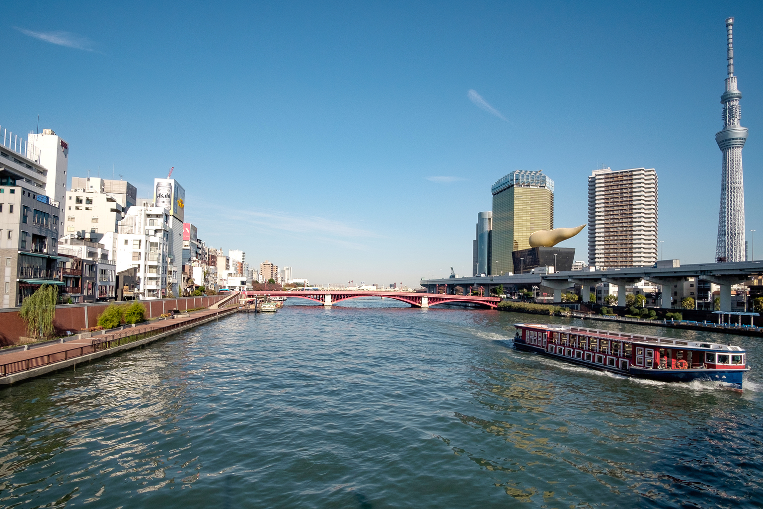 Positioned on the banks of the Sumida River, Asakusa has a great outlook on the water and the several bridges that cross it. A prime location for enjoying the view is from Kuritsu Sumida Park, right on the banks of the river. Every spring, the park’s cherry trees blossom to the delight of hanami partakers, who take up every square inch of park ground with tarps, or enjoy the sakura from traditional yakatabune houseboats on the water. Looming in the background across the Azuma Bridge, the Asahi Beer Tower can’t be mistaken – it’s the building that looks like a mug of golden beer, complete with frothy head. Tokyo Skytree is also omnipresent in the skyline to the East.