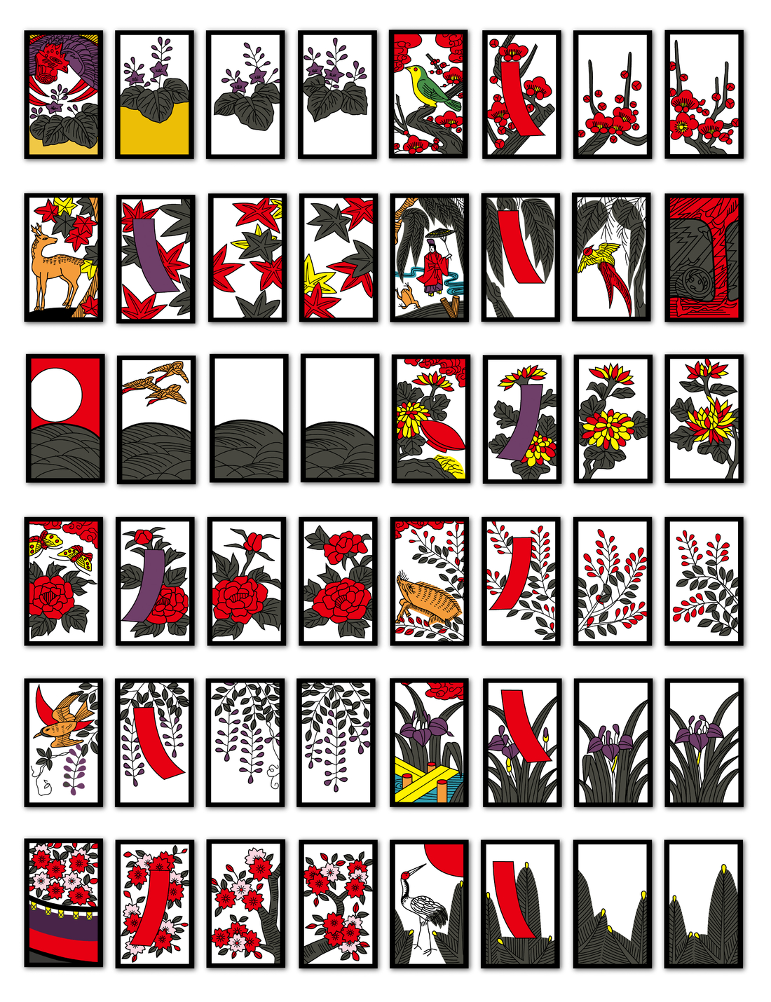 A hanafuda deck contains 48 cards, twelve sets of four, one for each month of the year. The cards don’t contain any numbers, only flowers and other symbols. For that reason, remembering the tokens, values and categories takes most beginners some time. It’s worth the effort, though. Several games are played using hanafuda cards. The two-player Koi-Koi and three-player Hachi-Hachi are among some of the most engrossing. The internet abounds with English instructions and ideas on how to play using these beautiful cards.