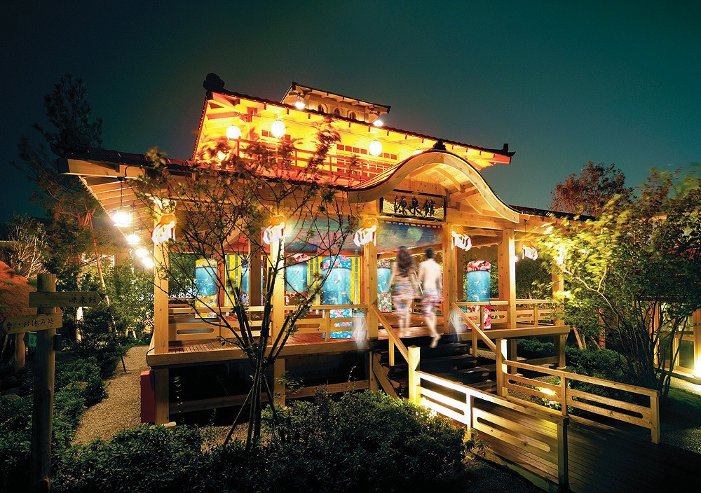Between July 28 and September 30, the open-air bath features a replica of the inner palace of Edo Castle, where the shogun’s consort, concubines and other women once lived. The seven pillars around the bath are actually aquariums holding colorful goldfish meant to symbolize these Edo-period women.