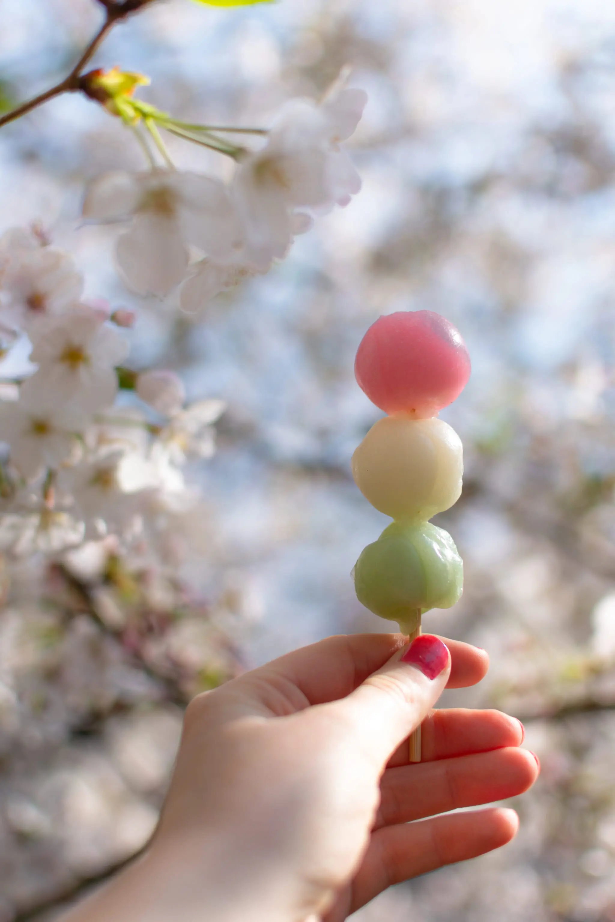 Hanami dango are perfectly tinted with cherry blossom colors for a reason. Take them to picnics and marvel at how well the colors match the trees.