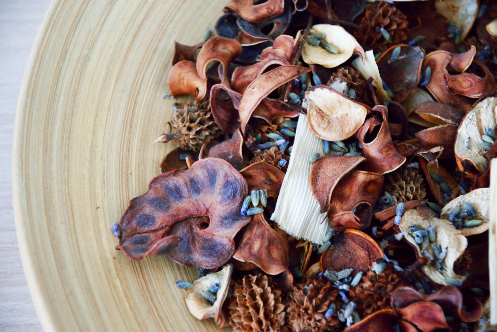 A less dangerous but just as decorative option is potpourri. Potpourri is a mixture of dry plants, flowers and herbs that slowly release fragrance. Depending on what your mix is made of, this can be a little more powerful than incense or candles. The best part about potpourri is that if you have trouble finding it in-store, you can always make your own using your favorite plants.