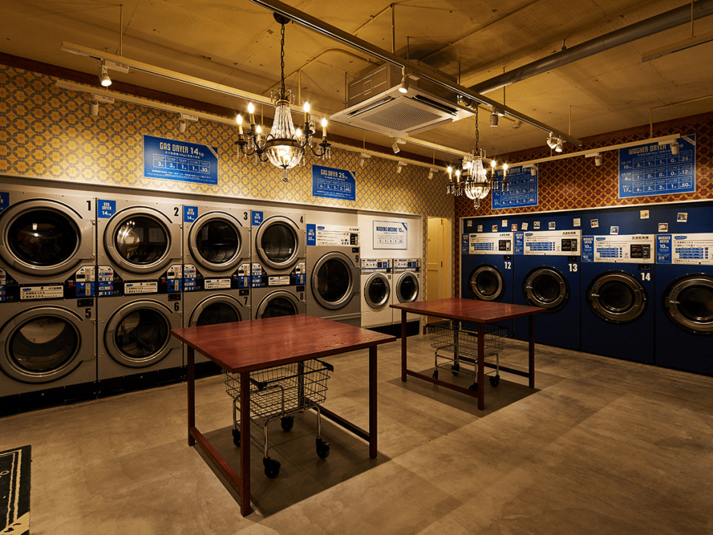 If the laundromat has become something of an unintentional extended living room, why not go all the way and make it into an intentional concept? Freddy Leck sein Waschsalon (literally “Freddy Leck his laundromat” – the grammatical crudity is mildly funny in German) does just that. The shop on Meguro-dori, very close to the Shimizu bus stop, fuses a wide, open café space with the usual rows and stacks of washing machines, and tops it all off with interior decoration straight from the German Wirtschaftswunder years (think Showa era nostalgia, expect tacky chandeliers and tackier wallpaper design).