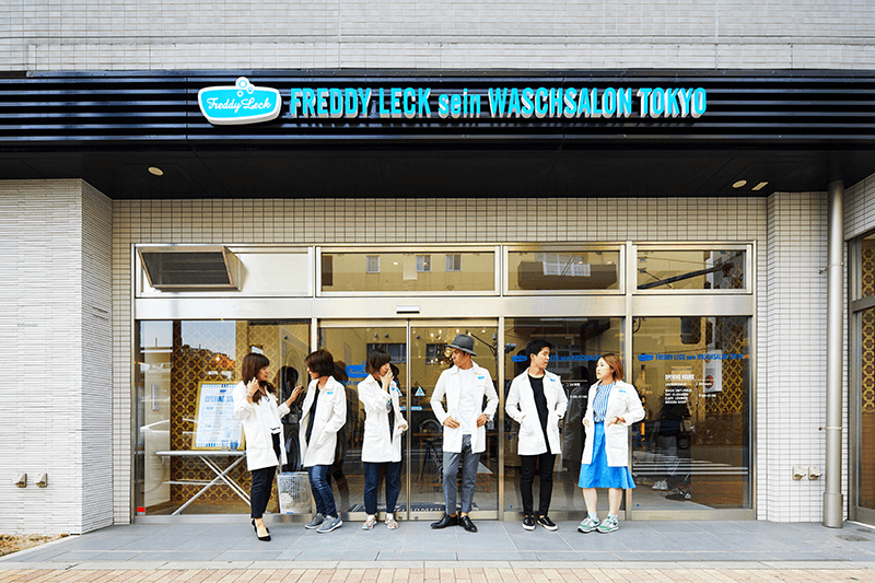 Sounds too good to be true? So is the titular Freddy Leck (it’s easy to abbreviate his name to “Fleck,” meaning ‘stain’). The bespectacled owner of the original shop in Berlin, often sporting an authoritative white coat and a grandfatherly hat, is actually an actor named Dirk Martens. His passion for doing laundry, however, is real. He already ran another laundromat before starting the Freddy Leck franchise, he has written a book about a life dedicated to getting stains out (or rather had it ghostwritten), and he has his very own line of detergents. The latter can also be purchased at the Tokyo store, along with other Freddy Leck memorabilia.