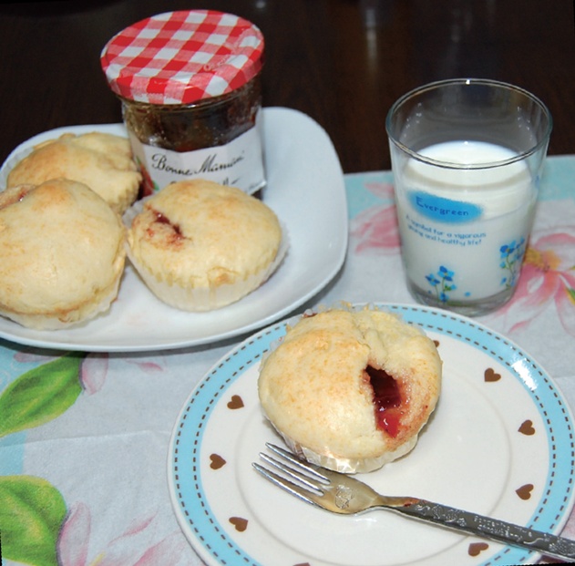Place one tablespoon of muffin mixture into paper lined muffin tins. In the middle of each put one large teaspoon of strawberry jam, then using the rest of the muffin mixture, fill muffin cups up to three quarters full.
