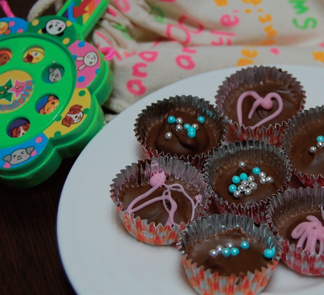 Put broken chocolate squares into a small stainless bowl and place over a saucepan of simmering hot water, making sure the bottom of the bowl does not touch the water. Stir chocolate slowly until completely melted. Transfer melted chocolate into foil cups using a teaspoon. Ask your little assistants to put their favorite candy decorations on top of each chocolate.