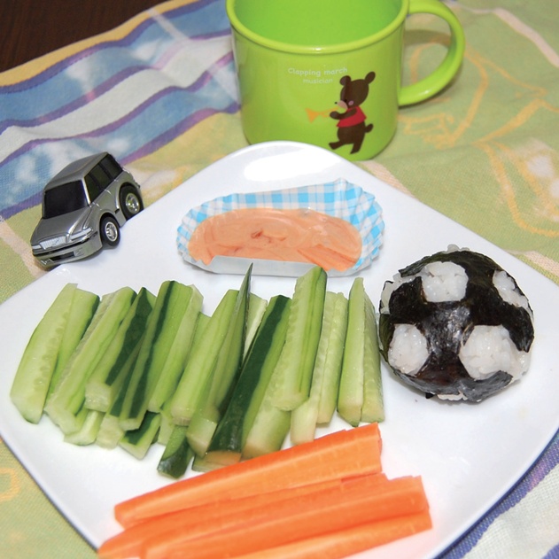 Cut cucumber and carrot sticks (celery, daikon, and bell pepper can also be used). Your little helper may want to use these to make grass and goal lines.