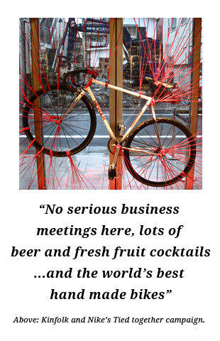 Another media coup came from Nike, the sportswear giant approached Kinfolk in the run up to the 2010 South Africa world cup, the “Tied together” campaign was a charity street sports event bringing together a cyclist, jogger, skater and photographer (to document the event) raising money for the (RED) AIDS foundation, the event took place in Tokyo and made its way around the world to finish in Johannesburg, South Africa. The guidelines for constructing the bike were simple: Use the colors of the Japanese flag and fit it to Tokyo’s most famous bike messenger, Shino. The whole process was filmed by Nike and the bike featured in a special window display at Nike stadium in Tokyo. More recently, trendsetters Hypebeast.com visited the bar and offered to collaborate on a blog, adding even more to the buzz.