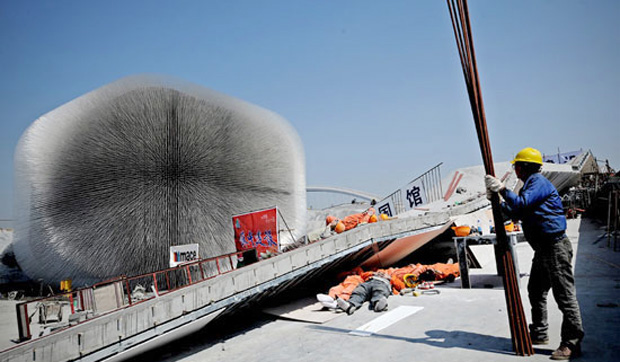 Seed Cathedral One of the most striking and amazing designs at the Expo, the British pavilion is made up of over 60,000 fiber-optic rods housing seeds at the ends of each one on the inside of the pavilion. Designed by Thomas Heatherwick, the 20 meter-high cube aims to “highlight how biological diversity has influenced and improved people’s lives.” The rods draw in natural light to illuminate the interior, and sit on a site resembling an unfolded piece of paper.