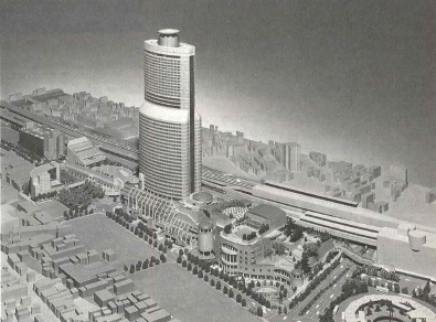 Regarding the elegant tower: the first eight floors will house shops, boutiques, cocktail lounges, banquet halls, banking facilities, parking areas and the Okura ACT City Hotel lobby. Offices will occupy floors 10-27. An information communications center will be located on the 27th floor; fitness studio, swimming pool and gymnasium on the 29th; lounges, bars and a medium-sized banquet hall of the 30th, a luxurious restaurant on the 31st. Okura guest rooms will be found on the 32nd through 44th floors, built around an elegant atrium. The observation gallery will be on top of the tower, the 45th floor. A heliport tops the entire affair, all 212.7 meters of it.