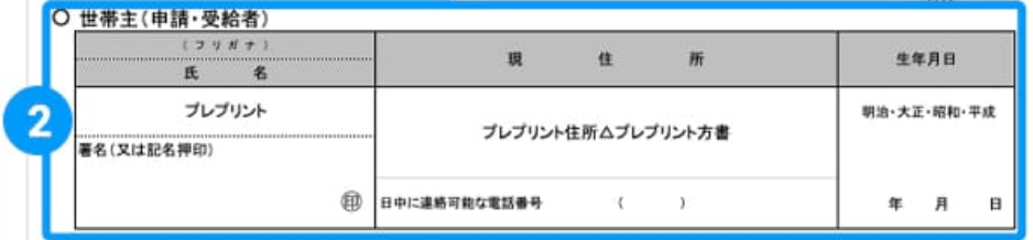 Section 2 is all about the applicant’s (head of household) personal information. Under 氏名 write your full name as it appears on your residence card. Above your name, in the place where it says フリガナ, also write your name in furigana (the katakana pronunciation of your name). If your name is already printed out in the application form, write it once again in the 著名 field. Stamp the 印 circle with your hanko if you have one. If you don’t have one, put your official signature in the same circle. Under 現住所 write your current address if it’s not printed already. Below that, in the 日中に連絡可能な電話番号 field, write your telephone number. Next, write your date of birth in the 生年月日 field. If you’re born on May 7, 1985, it should look like this: 1985年5月7日. Above that, you will find the name of the past four eras, from Meiji (明治), Taisho (大正), Showa (昭和) and Heisei (平成). Put a circle around the era when your birthday falls in.