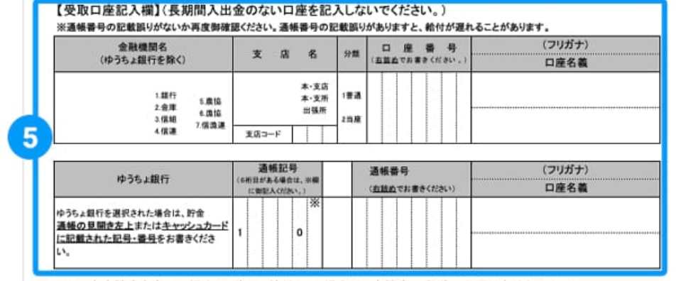 In Section 5 write your bank account details. Under 金融機関名, write the name of your bank and circle 1 for “bank.” Next, under 支店名, write the branch. In 支店コード write the branch code. Next, under 分類, choose 1 for regular account and 2 for saving account. In the field next to this, write your bank account number. Next to it, write the account holder as it appears on your cash card or bank book. The field under this is for account holders at Japan Post Bank (Yucho Ginko).
