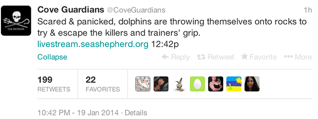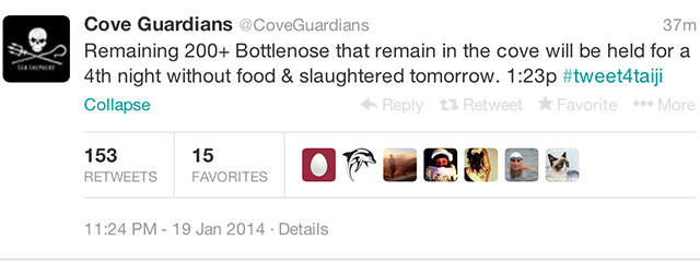 Followers of the SSCS and other wildlife conservation organizations continue to express their outrage, tweeting their disapproval with the hashtag #tweet4taiji. Along with the live-stream, the SSCS official Twitter account is live-tweeting updates and images at the cove.