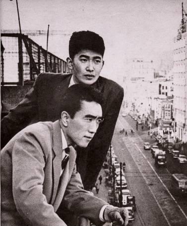 Shintaro Ishihara (back) with writer Yukio Mishima in 1956