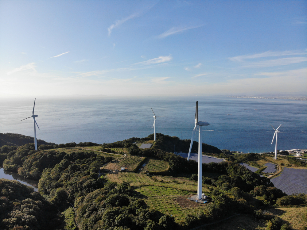 Aerial drone photograph of wind turbines and solar panel in Hyogo Prefecture