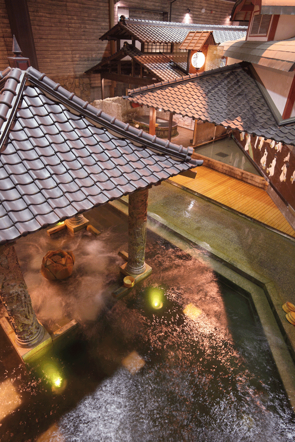 Of course, Hakusuikan is, first and foremost, an onsen ryokan. There are onsen options everywhere. The main hot springs hall is enormous. It takes a bit of walking around the maze-like campus to find it at first, but the journey is worth it. While much of the hotel replicates an Edo-style building, the onsen hall imitates a Genroku (Golden Age of Japan: 1688–1704) style; there is a tall wooden bridge over a large hot spring, and smaller hot springs are divided into small rooms that look like traditional bars, with lanterns hanging over them and Meiji-jidai-style artwork covering all of the walls. Plants grow everywhere, making it feel more like a small town than a bathing area.