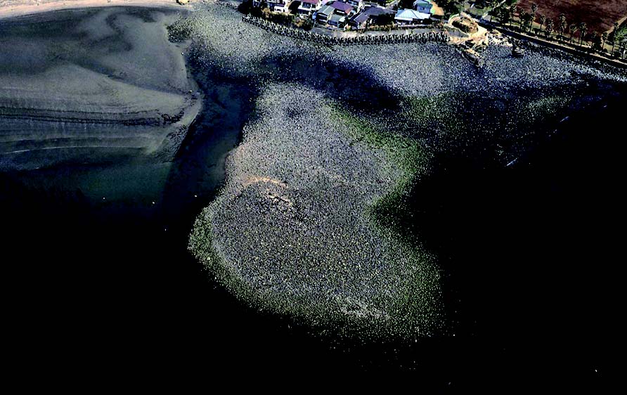 Nowadays, the island sits barely above the water’s surface, and its 200-meter wide girth can only be seen during low tide. Besides the pebbles, a few ancient pilings are all that remain, and on the beach the site is commemorated with a large stone edifice and a separate signboard, explaining the history of this ancient effort at reclaiming land from the sea.