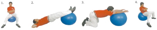 1. Keep the position of your head and upper body stable as you sit on the ball. Slide your pelvis from right to left while supporting your weight. Breathe while sliding and repeat slowly ten times.