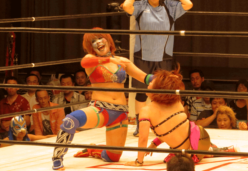 Stardom is joshi’s most publicized promotion. Like AJW, its focus is on finding the sweet spot between pop culture and old school wrestling legitimacy. “Joshi needs more media exposure. More people need to see it, not only wrestling fans, but other people as well. That’s what Stardom tries to do,” says Act Yasukawa, one of Stardom’s top wrestlers.
