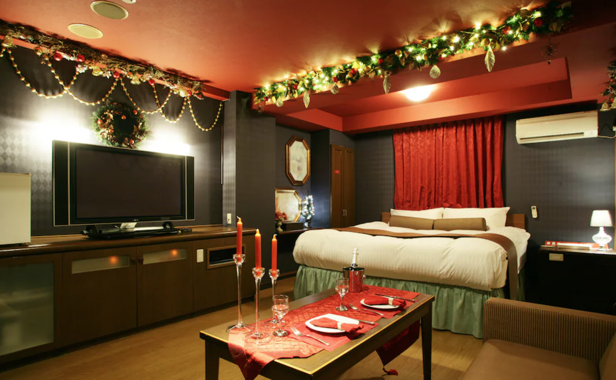 The Sara Grande in Gotanda has it all. For couples who are up for a bit of roleplay, you can do worse than find a room at this inn. No matter your kink, Sara Grande probably has it, including a fake gym, complete with weights, called The Fitness. There’s also The School roleplay room, featuring classroom desks. And of course, Christmas is no exception. The My Lover is Santa Claus room will have you jingling bells into the new year, as you have a merry rest on the red bed, while admiring the jolly Santa scene on the wall.