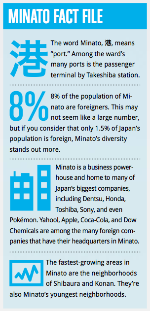 With a collection of neighborhoods that includes the harbor side areas of Shibaura, the offices and parks of Akasaka, and the upscale cosmopolitan hubs of Azabu-Juban and Shirokanedai, Minato Ward boasts a wide variety of urban zones in a small area of land. Dozens of Japan’s top companies have their headquarters there. It’s also the ward with the highest proportion of foreign residents: the citizens of 130 different nations make their home in Minato, and the embassies of 82 different nations can be found in this “little UN.”