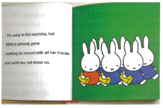 See below a simple picture of Miffy and her friends, yet Miffy is the only one with a red dress on, the others wearing blue and looking exactly the same as Miffy and each other. The story starts with Miffy making her way to school and continues with her doing some simple arithmetic, singing in choir, building blocks, dancing, drawing a picture, and finally having a book read to the class by their teacher. Although she is four years old in many stories, she celebrated her 50th anniversary a couple of years ago, making her 52-years-old! And for you Miffy connoisseurs, if you go to Dick Bruno’s hometown of Utrecht, Netherlands, you’ll be able to experience a little square named after her, the Nijntjepleintje and a little museum solely fof Miffy!