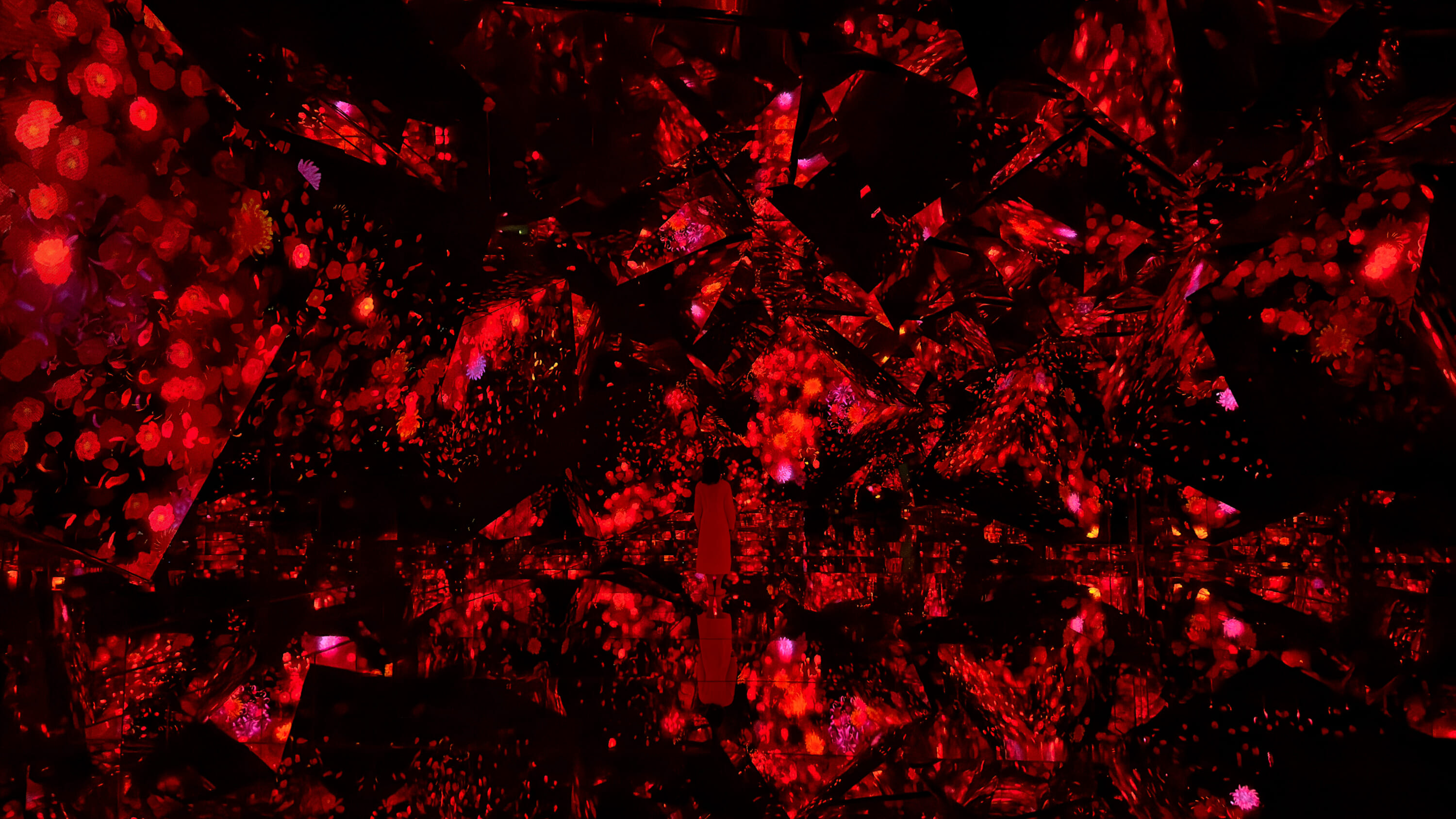 We saw “Flowers and People – Megalith Crystal Formation (work in progress)” that shows a cycle of growth and decay of red flowers. In fact, the flowers are influenced by the people moving around. When they move, the petals scatter. When they stand still, the flowers bloom more. The artwork is not pre-recorded. It’s created by a computer program that continuously renders the work in real time.