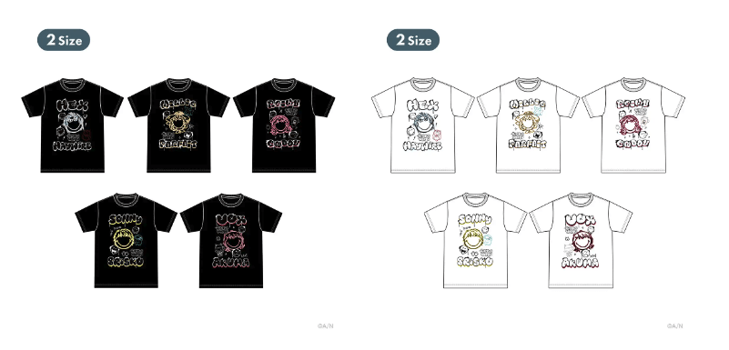 Indulge in some shiny V-Tuber threads such as these t-shirts (¥5,400) bearing chalk-like drawings of the V-Tubers themselves. The art style employed truly gives it a handmade feel as though they were drawn by your very own oshi. The black version really pops with an almost neon-like effect while the white one would be perfect for summer.