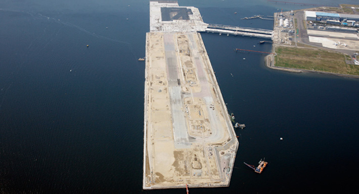 Three methods of construction were proposed for runway D, each with differing problems and benefits. Eventually the construction companies decided upon a hybrid solution. A steel latticework would sit in the mouth of the Tama River, allowing maximum water flow into the bay, and an artificial island would be constructed, with bridges joining it to Haneda island. Undertaking such a large project right in the flight path of one of the world’s busiest airports is no simple feat. Huge floating cranes were needed, but they stand up to 130 meters above the water, so to keep the runways operational, even the lifting equipment had to be redesigned. A huge lifting crane built by Yoshida was reduced in height from 83 to 49 meters and reduced in weight. Groups of ships were also used to drive piles into the sand to create a solid foundation, with GPS systems utilized to ensure they stayed on track as they worked around the clock.
