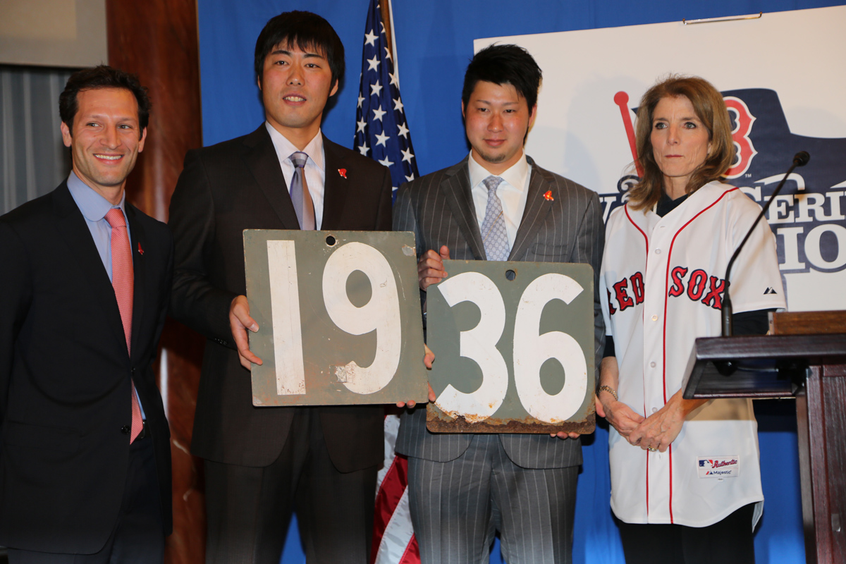 Red Sox SVP, Marketing, Adam Grossman, Red Sox players Koji Uehara and Junichi Tazawa, Ambassador Kennedy