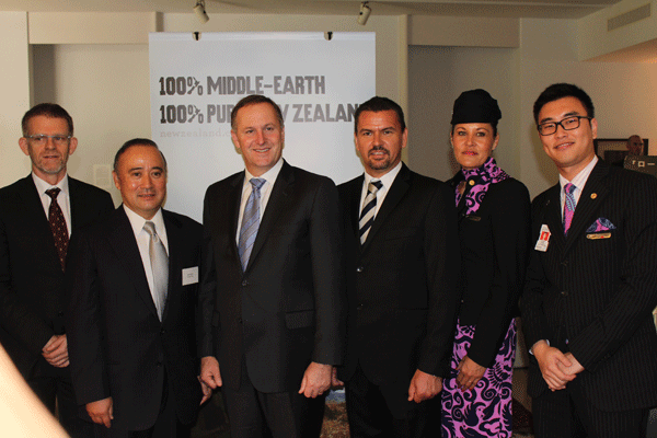 Mark Sinclair, the New Zealand ambassador with Warner Bros. Japan’s William Ireton, Prime Minister John Key, Ed Overy of Air New Zealand and cabin crew members Adelaide and Eddy
