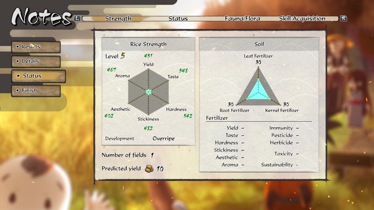 Once the rice has grown and is ready to harvest, you chop and dry the crops before threshing and grinding the rice by hand. With every in-game year, you get more and more rice to sow and grow, and these processes will take longer and longer. While you have the option to let other characters handle each task, remember that they might not do as great as a job as you, and the quality of the harvest will consequently suffer. Finally, the season ends with a detailed report revealing which areas you might want to focus on next season to grow the optimal batch of rice.