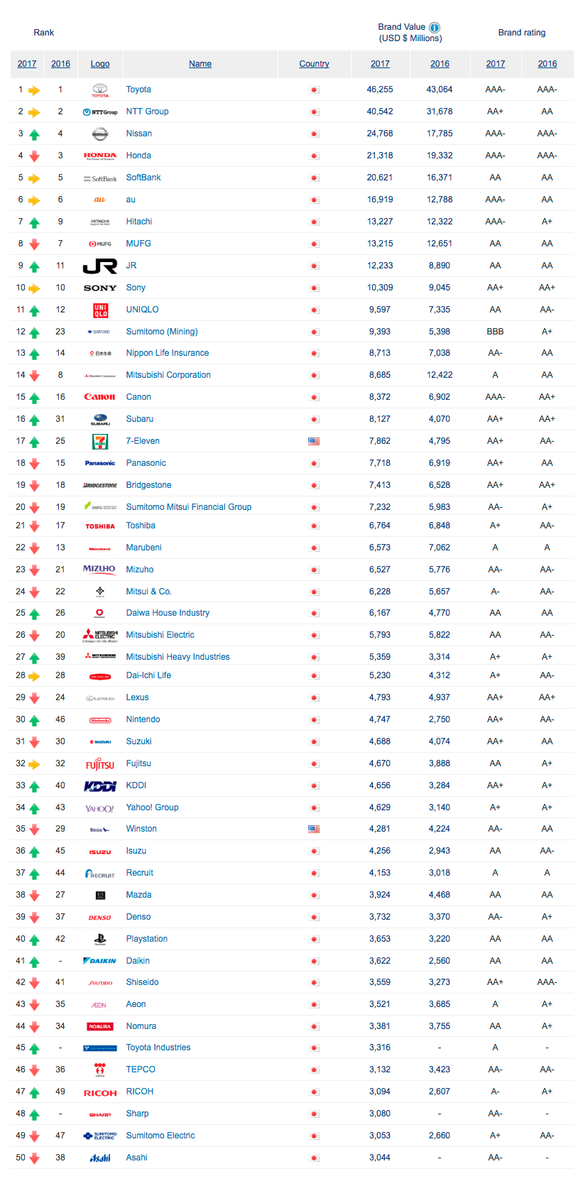 As Brand Finance explains, a brand’s strength is assessed by factors such as marketing investment, familiarity, preference, which helps the firm determine what proportion of a business’s revenue is contributed by its brand. Every year, they compile the top 50 brands for their Brand Finance Japan 50 league table.