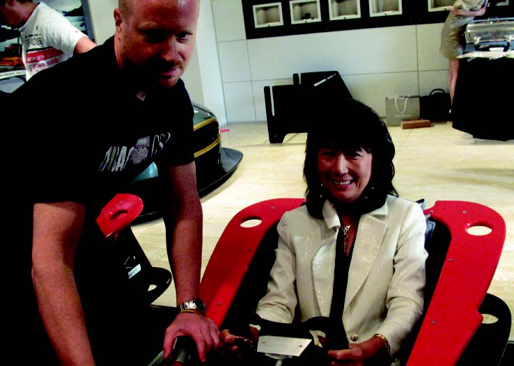 Still on the subject of busy people, Shintoyo Company’s top execs Sho Katayama, his wife Mary, and their son Yushi hosted a champagne party at their luxurious Aoyama Aston Martin showroom. The glittering evening was to commemorate the partnership and the beginning of Aston Martin racing in Japan. The DBR9 GTI racing car, as well as the DBG GT Limited, were on display. The showroom was filled with people you could see were at the top, enjoying the wonderful cars, the champagne, and the company, while also showing off their driving skills on one of the simulated racing cars.