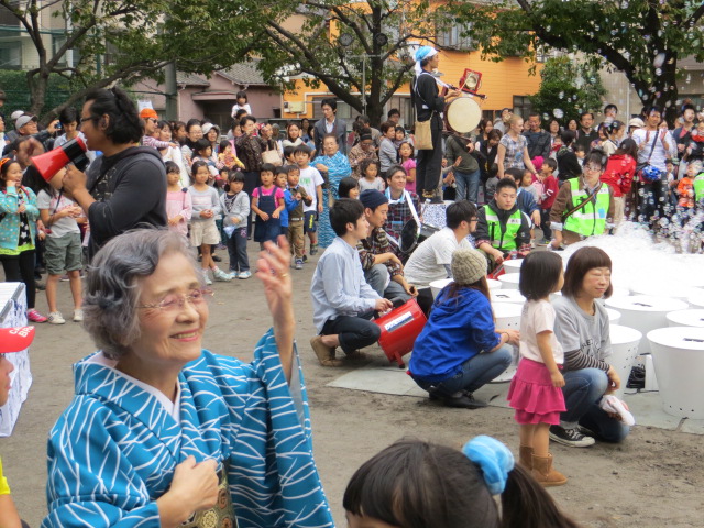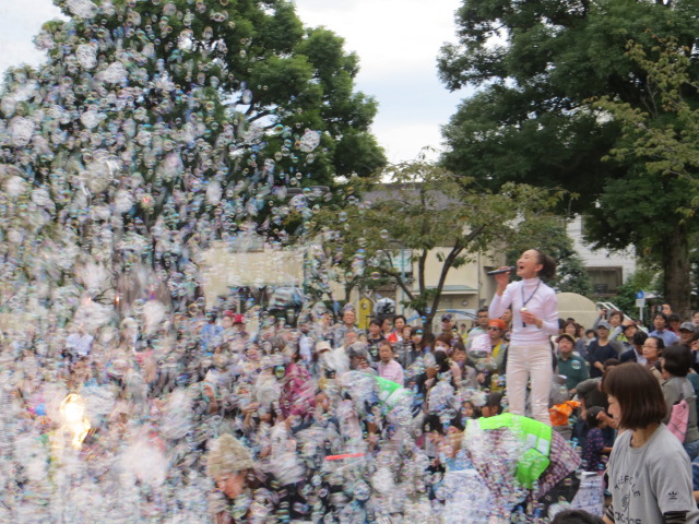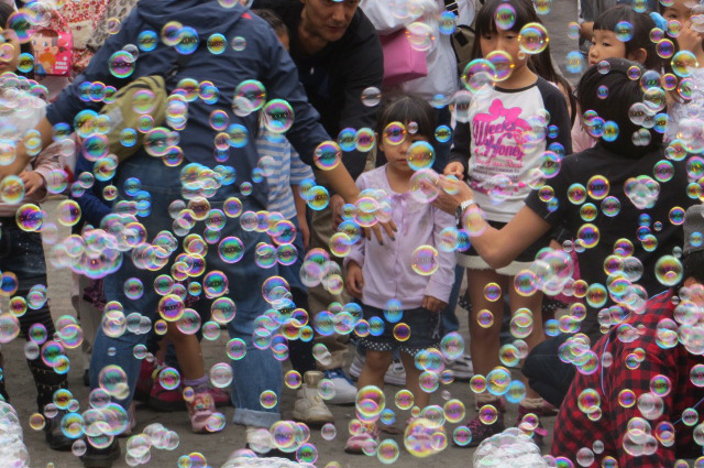 Through his installation, Shinji Ohmaki managed to tap directly into the strong sense of community spirit that exists in Japan. It was an afternoon of of togetherness, with friendly obachans selling homemade yakisoba and bottles of tea. People were smiling and laughing and having fun. That may sound like a very simple statement, but that means a lot in a modern world that can sometimes feel overwhelming. Demonstrating the use of minimal material for maximum perceptual effect, Ohmaki’s Memorial Rebirth series produces a thick atmosphere of bubbles that suddenly appears in an urban area and disappears rapidly. It’s a spectacle designed to provide viewers with a sense of being drawn into an energized space—as if the energy were there all along, conserved in memories that are still floating around the playground.