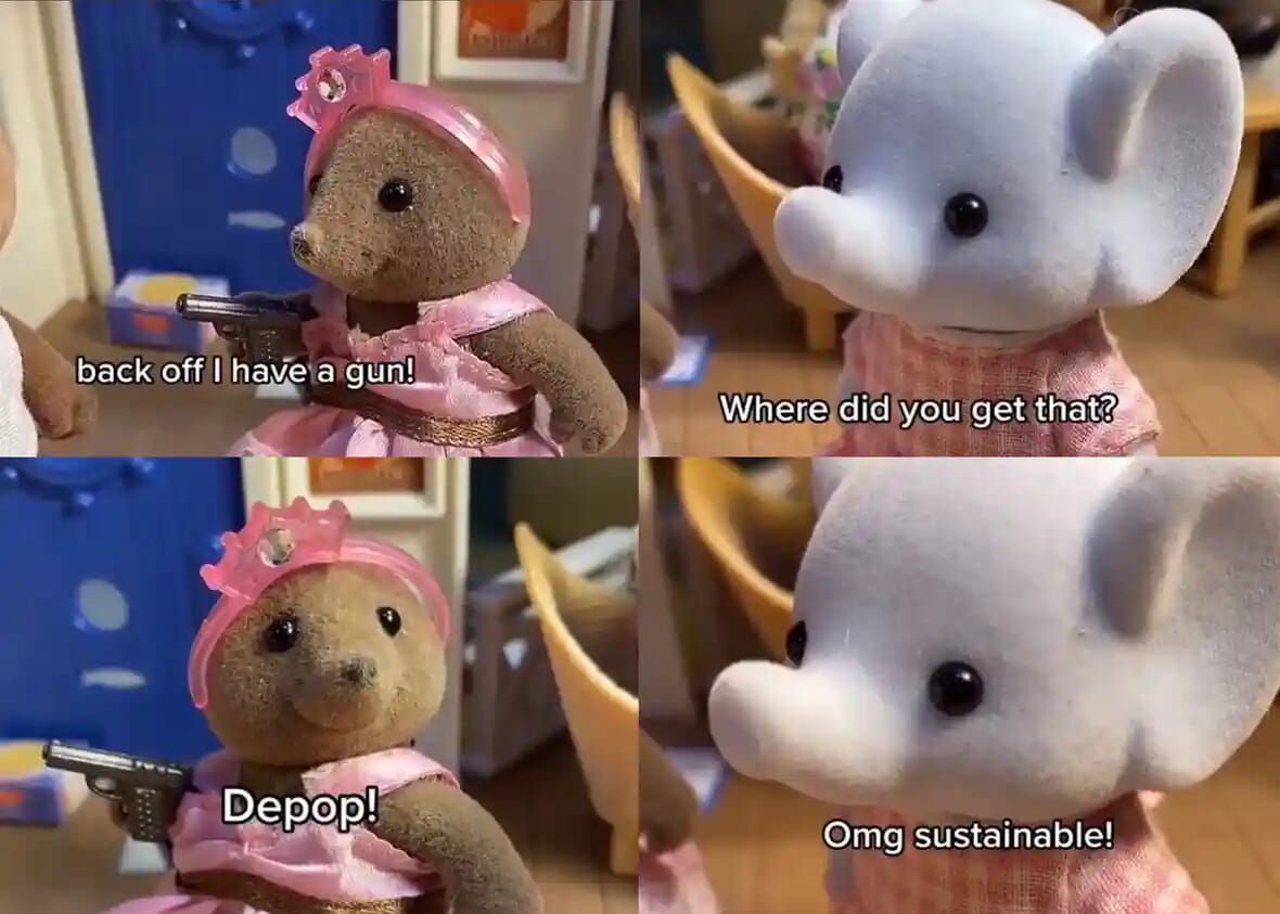 At a bleak time when Zillennials were being bombarded by a never-ending scroll of disposable content on TikTok, the Sylvanian Drama skits immediately stood out for their deadpan humor, plot twists and questionably adorable visuals. Often set to 2010s pop hits, the skits communicate dialogue solely through text overlays, with rapid sequences of one liners, dramatic zoom-ins and internet lingo. Uniquely hypnotic and addictive, the videos take a comedic approach to topics like modern dating, diet culture and politics with layers of internet and pop culture references.