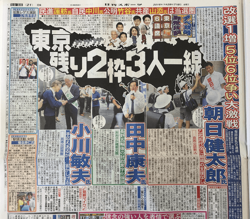 One of them is the musician Yohei Miyake, who is running as an unaffiliated candidate. While he may not wield much political clout or be much of an influencer when it comes to mainstream politics, one area where he has been very successful is in his ability to draw massive crowds (see the video below) to his “Senkyo Fes” (Election Festival) events, which combine the energy of a live show with Miyake’s straightforward, no-nonsense discussion of social issues that are important to younger voters. Even if he may not be able to secure himself a seat in the Upper House, it will be heartening if the former rocker manages to make a strong showing at the polls.