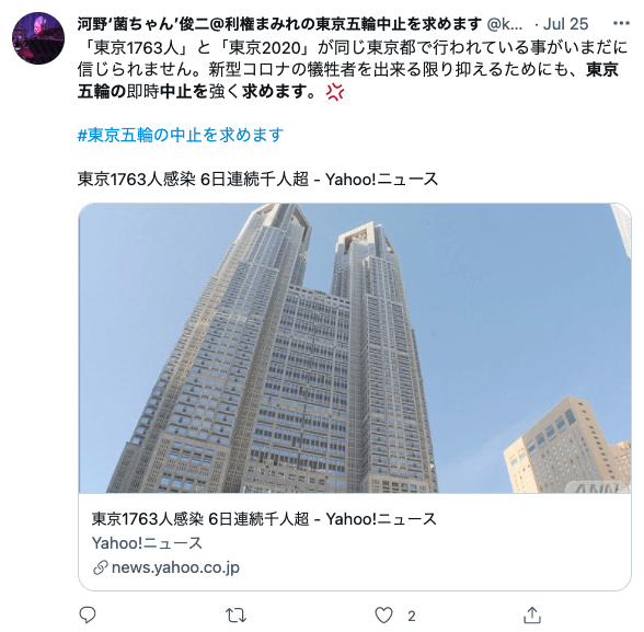 This hashtag became the most used phrase for this issue when lawyer Kenji Utsunomiya started an online petition against the Olympics that went viral. It continues to be used actively even after the start of the Games last week.